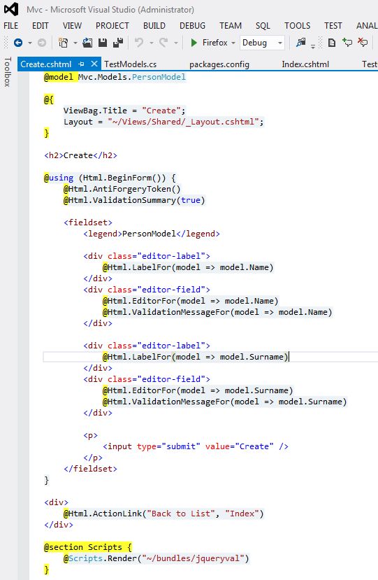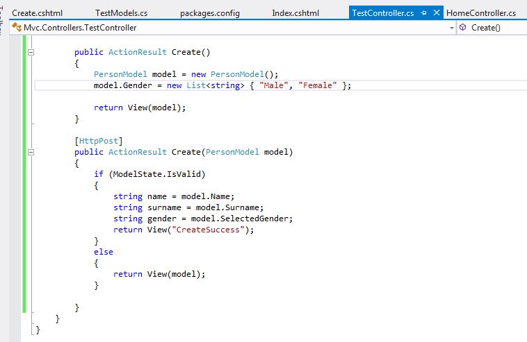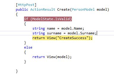 First we check that the data in the Model is valid, in our case we do have some data for both Name and Surname. At this point, we would save it to a database for example and display a simple View with a success message. We’ll leave this to you, you should be able by now we create the proper View that can do this.