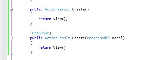 Then once the user fills in the data and presses the Submit button, they will be taken to the second one. Please note that we decorated the second Action with [HTTPPost] and we are also passing the Model as parameter. The MVC engine will take care of us in this respect.