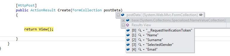 Let’s modify the HttpPost action so that it does not take a model as parameter anymore. Instead it will take a FormCollection object.