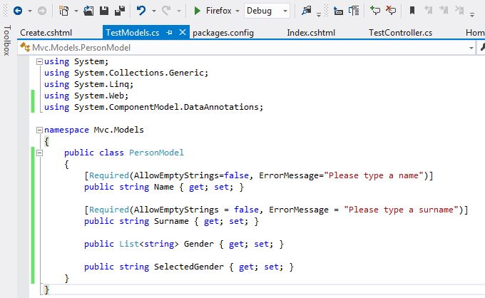 All the basic validation can be done in our Model class. All we have to do is open the TestModels class and decorate both Name and Surname public properties with [Required].
