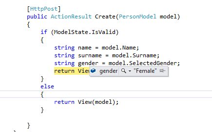 If you look at the HTML Helper for DropdownList, you’ll notice that the first thing we tell it is where the post value is stored in our model and that is the SelectedGender property. Then we create a SelectList from our Gender data. There are more ways to build the dropdown and I encourage you to explore them all as they will come in handy at some point.